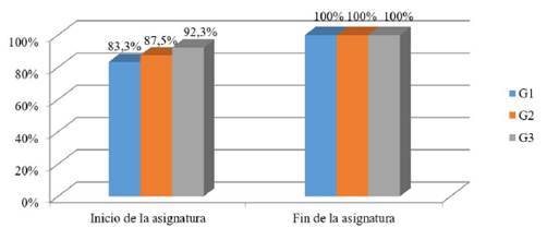En cuanto al estudiantado, un total de 39 estudiantes (18 en G1, 8 en G2 y 13 en G3) completaron satisfactoriamente el cuestionario distribuido tanto al comienzo como al final de la asignatura. La mayoría de ellos eran mujeres (77,8% en G1, 87,5% en G2 y 76,9% en G3) y todos los estudiantes participantes, a excepción de uno de ellos, tenían entre 19 y 22 años.