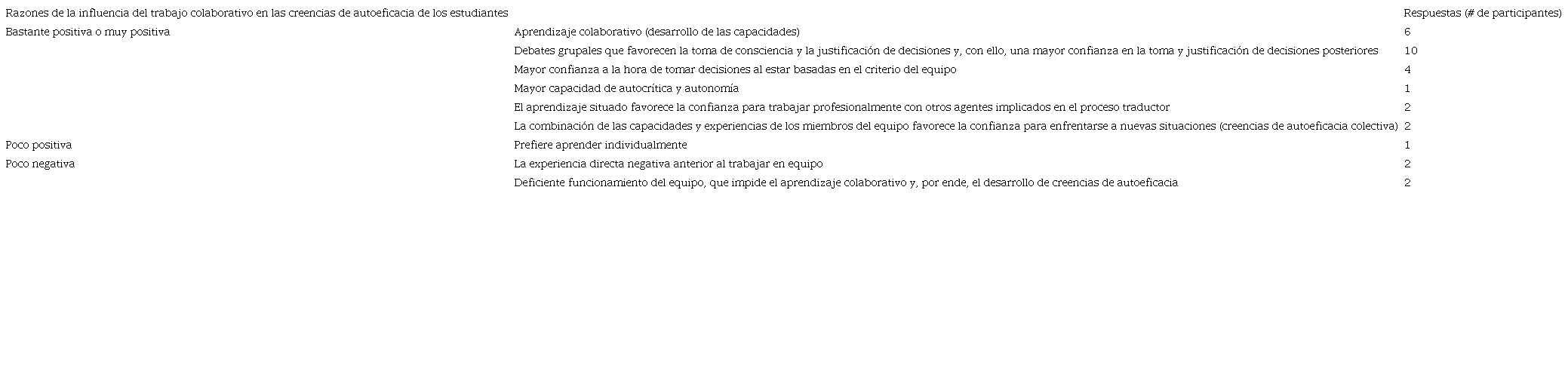 A modo de resumen se recogen en la Tabla 1 los principales resultados que han arrojado los grupos de discusión posasignatura, es decir, las razones por las que, de acuerdo con los participantes, el trabajo colaborativo durante la asignatura Traducción Especializada ab (español-inglés) ha influido de un modo u otro en sus creencias de autoeficacia.