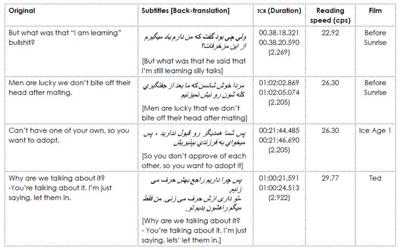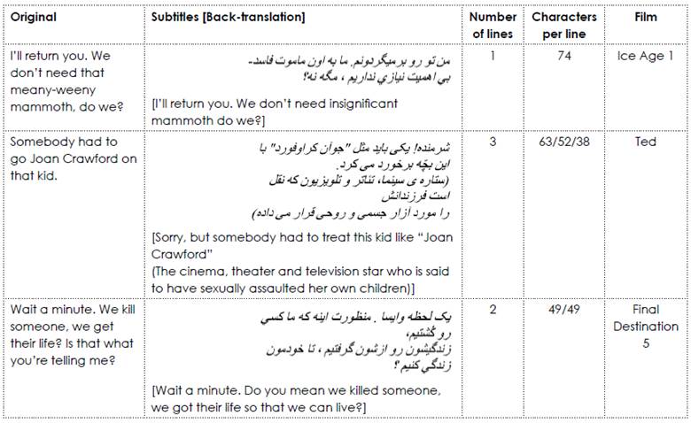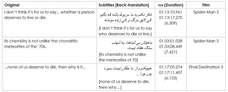 This section examines the results of the textual analysis of Persian fansubbed products. Currently, Persian non-professional subtitles are mainly released in the form of soft subtitles (srt files) as far as American films and tv series are concerned. The present analysis includes reading speed, spatial and temporal constraints, readability and creativity. It is worthy of note that the aim of this analysis is not to criticize the amateur subtitling practice but to offer a general account of the fansubbing scene in Iran. Therefore, we do not judge the appropriateness of fansubbing practices, but we recommend experimental reception studies in this sphere (Abdi & Khoshsaligheh, 2018; Khoshsaligheh, Ameri, Khajepour, & Shokoohmand, forthcoming). It should not be ignored that lay viewers may understand quality quite differently from translators or other professional agents (Orrego-Carmona, 2018).