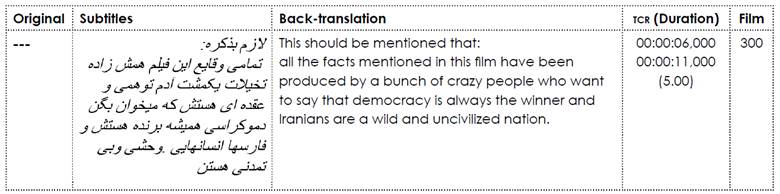 In the film 300 (Snyder, 2006)-which is said to be an anti-Iranian Hollywood film and angered many in Iran-the Persian fansubber took a further step and warned the viewer of false facts presented in the film in the very first subtitle line (Table 7).