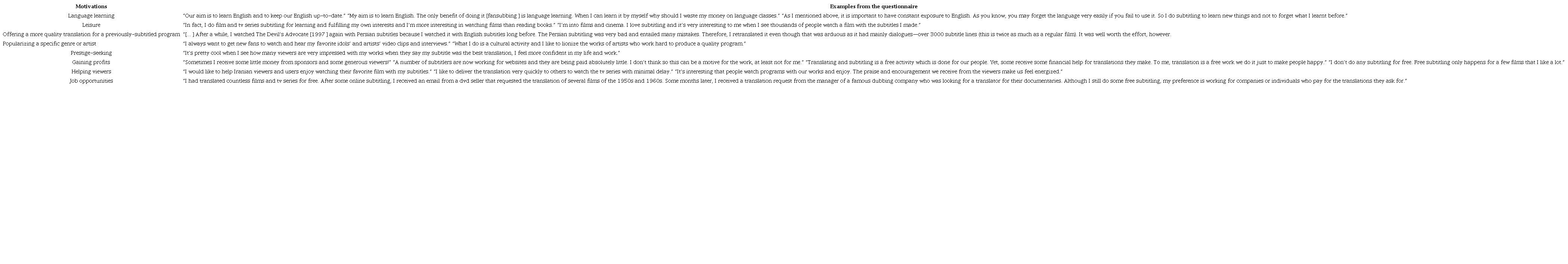 One of the questions in the questionnaire aimed to explore the factors motivating amateur subtitlers to undertake subtitling. Table 1 illustrates the types of motivations mentioned by the respondents.
