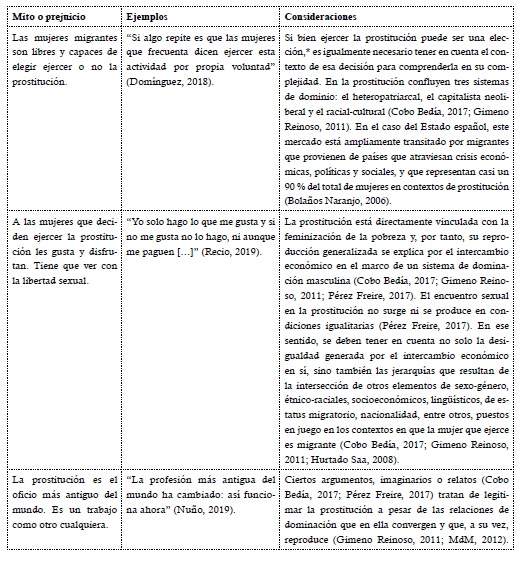 De la misma forma, y siguiendo con la metodología multidisciplinar, la Tabla 2 surge también de la elaboración propia a partir de la puesta en común de algunas ideas y datos provenientes de la sociología y de la antropología (Cobo Bedía, 2017; Hurtado Saa, 2008; Pérez Freire, 2017), del activismo y de las políticas públicas (Bolaños Naranjo, 2006; Gimeno Reinoso, 2011), así como de otros registros de organizaciones o instituciones sin ánimo de lucro (alter Grupo de investigación, 2008; MdM, 2012). Como en el caso anterior, en la primera columna de la Tabla 2 se presentan algunos de los mitos o prejuicios que circulan en el Estado español acerca de la prostitución, seguidos, en la segunda columna, de algunos ejemplos que ilustran esas representaciones encontrados en la prensa.13 En la columna final de la Tabla 2 se plantean algunas consideraciones sobre dichos mitos o prejuicios.