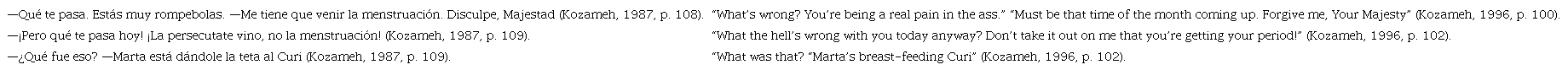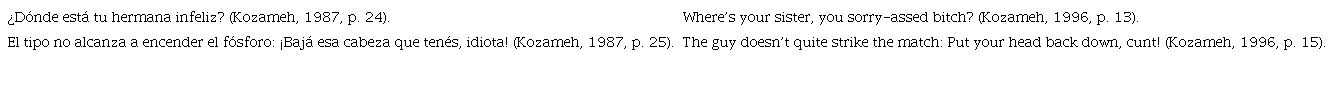 This section looks into the translation of culturally-bound metonyms of silence. The imposition of silence on women in 1970s Argentine society is a pervasive theme in Pasos bajo el agua. The narration foregrounds that Sara, the main character, has been expected to remain silent since very young. As young as five, her own mother already strove to prevent her from speaking: “Pero nena, callate, callate, dejá de hacer preguntas…Cerrá la boca” (Kozameh, 1987, p. 29) (“Come on now, shut up, shut up, stop asking questions…Shut your mouth!” [Kozameh, 1996, pp. 18-19). For Sara, silence would later become a procedure of control and subjugation by the regime, which deprives its opponents of their voice by incarceration or death. Far from accepting this passively, she resists and never relinquishes her female self to male-determined practices and mandates. The examples below evidence how translation re-inscribes silence in the target language.