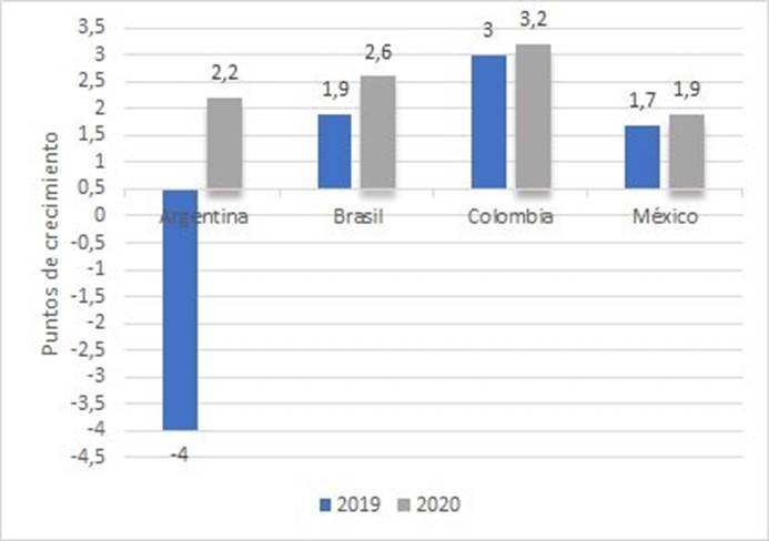 Si nos centramos en los países objeto de estudio en este artículo (Argentina, Colombia, Brasil y México), observamos que, según datos del Banco de España (2019), en el año 2019 se presentó una deceleración en Argentina y un crecimiento mínimo en el resto de los países (véase Figura 1). Otras previsiones del 2020 resaltan el crecimiento de Argentina y el estancamiento de Colombia, Brasil y México, con subidas de tipo mínimo.