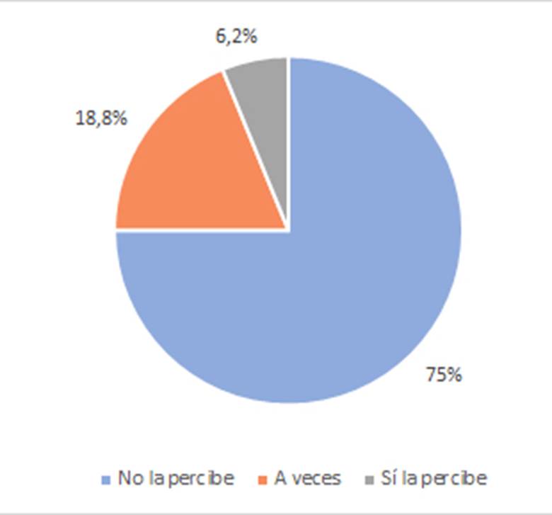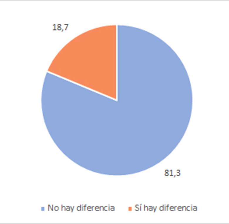En relación con la pregunta sobre la opinión generalizada de que las mujeres tienen distintas capacidades y habilidades que los hombres cuando traducen para este sector y envían los textos a sus clientes, un 75 % indicó que no percibían esta diferencia, un 18,8 % que a veces, y solo una traductora respondió que sí la percibía (véase Figura 4). Estos datos vuelven a mostrar que las mujeres traductoras no perciben que el cliente las trate de manera diferente por ser mujeres o que les atribuya capacidades y habilidades diferentes a las de los hombres.