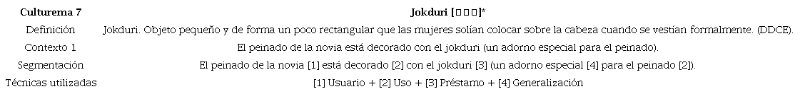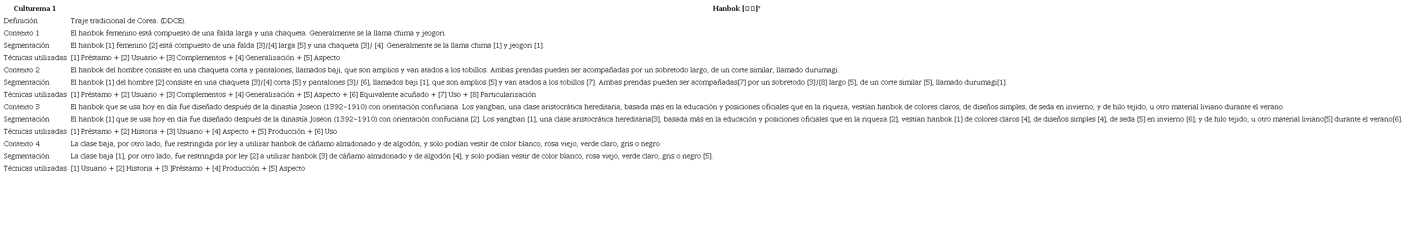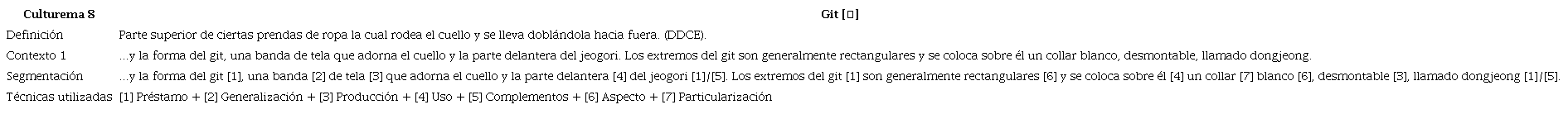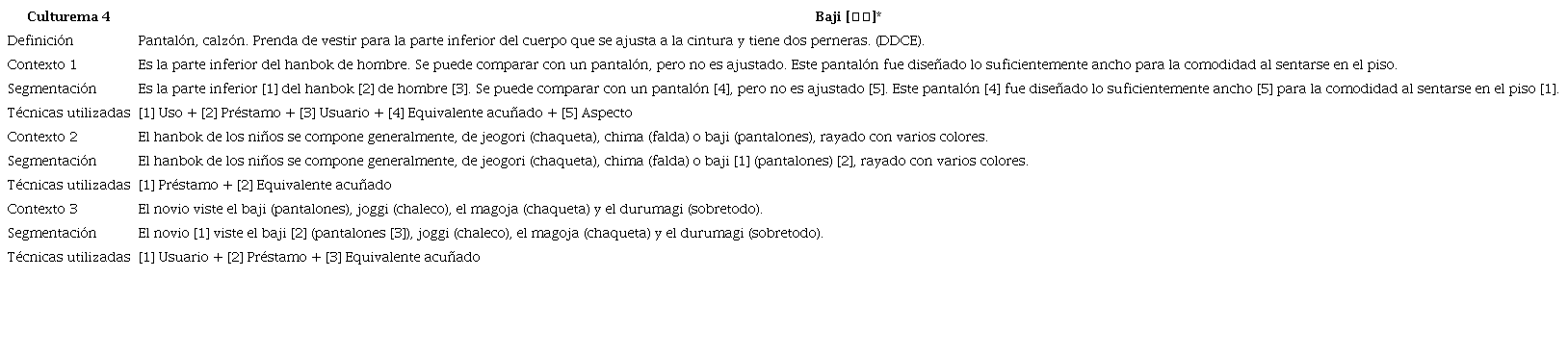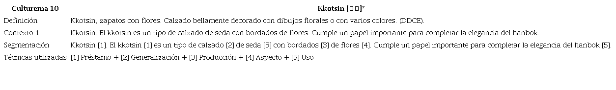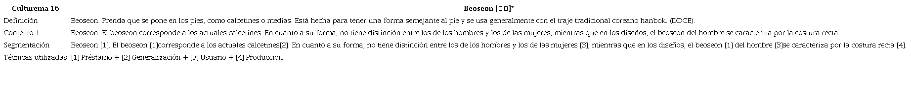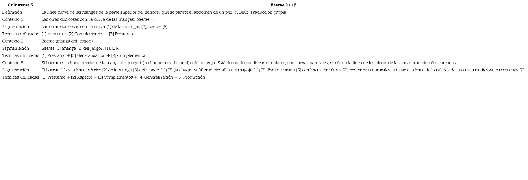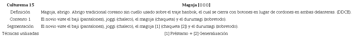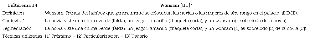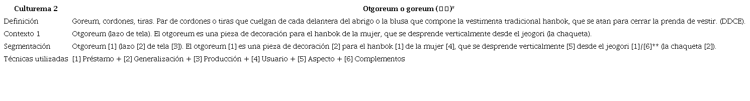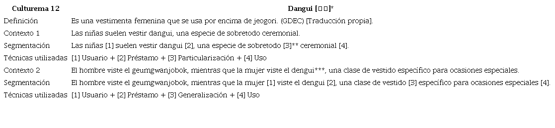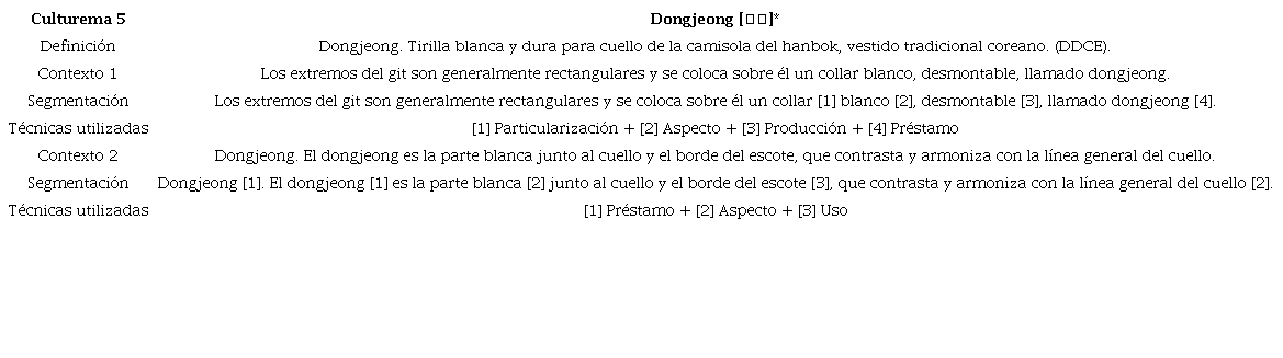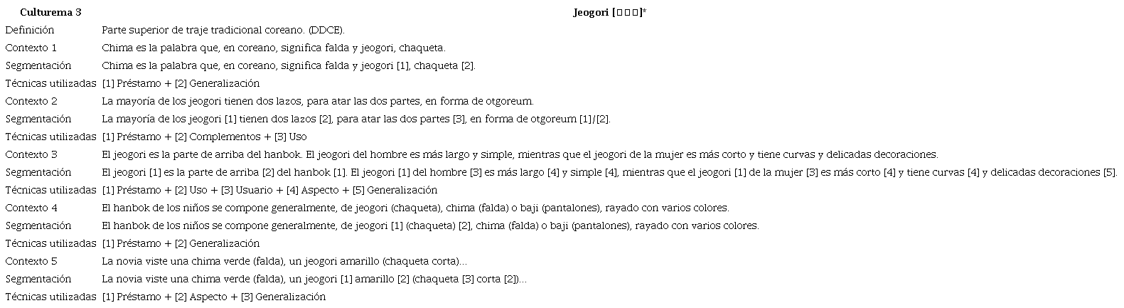 Sin embargo, hemos detectado algunos culturemas que resultan complejos de delimitar. Es el caso de, por ejemplo, donjeong (‘tira blanca y dura para el cuello de la camisa del hanbok’), baerae (‘curva de las mangas de hanbok’), dangui (‘sobretodo femenino para eventos ceremoniales’), wonsam (‘sobretodo femenino para la ceremonia nupcial’) y magoja (‘un tipo de chaqueta que se utiliza para protegerse del frío’). Se trata de culturemas raramente empleados hoy día y limitados exclusivamente a los discursos de especialidad de los sectores de la producción textil o de la historia del arte. Este fenómeno tiene que ver con el uso actual de esta vestimenta: pese a su larga tradición, se restringe su empleo a eventos especiales o festividades nacionales. Como consecuencia, estos culturemas van perdiendo su naturaleza de pertenencia a la cultura popular y van dejando de ser conocidos por los hablantes; de modo que hoy día su adquisición por parte del nativo exige de una instrucción particular.