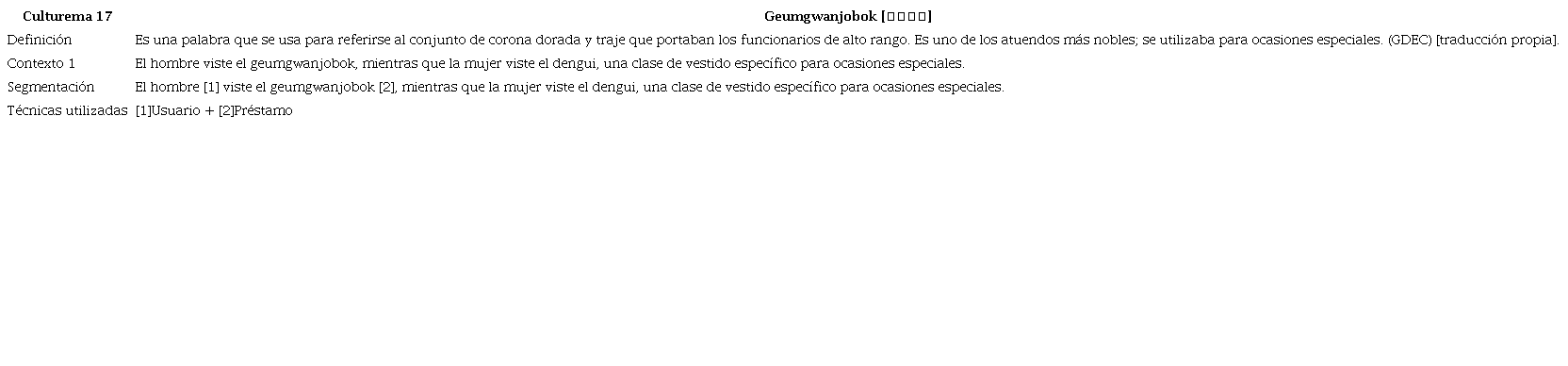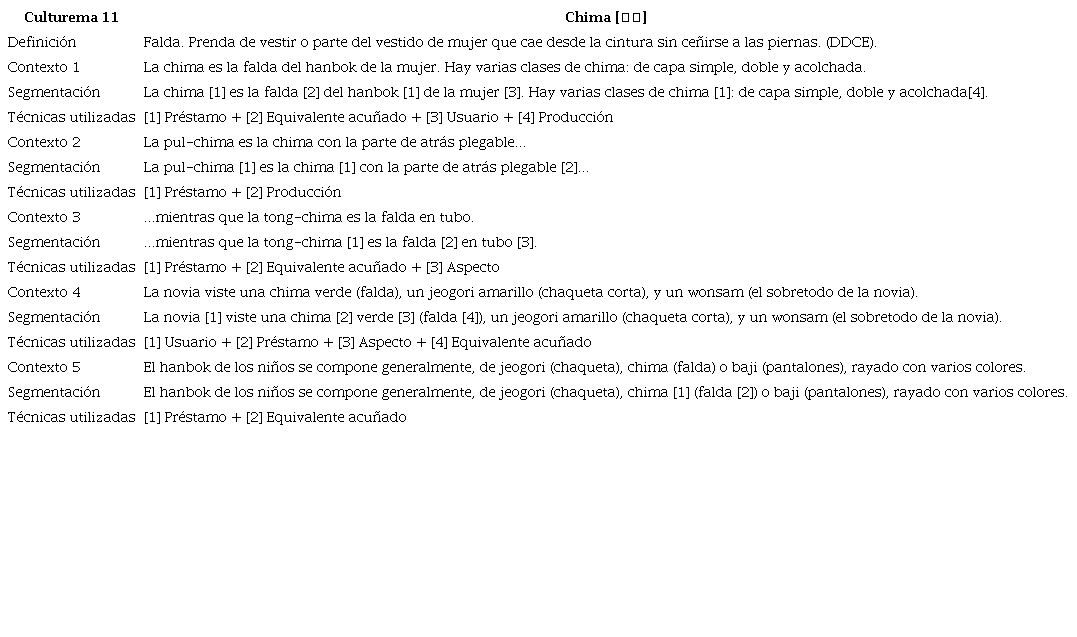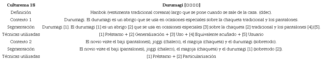 Una vez realizado el vaciado de nuestro corpus, procederemos a analizar los culturemas del ámbito de la vestimenta tradicional de Corea: el hanbok. En nuestro primer acercamiento al conjunto de culturemas, hemos identificado la presencia de una serie de técnicas12 empleadas de manera recurrente en la trasposición de términos coreanos al español y que, como hemos mencionado anteriormente, forman parte del listado propuesto por Molina Martínez y Hurtado Albir (2002, pp. 509-511), al que se suman otras técnicas para la ampliación de información de las unidades o segmentos marcados culturalmente de Mayoral Asensio y Muñoz Martín (1997, pp. 148-149). No obstante, al trabajar con culturemas relativos a la vestimenta tradicional coreana, aquella empleada desde la antigüedad, que se ha ido consolidando, preservando como patrimonio a lo largo de los siglos, pero que en la actualidad tiene un uso restringido a determinadas celebraciones, eventos y circunstancias, se amplía aún más la ya honda brecha cultural entre Corea y los países hispanos, al añadir también la distancia temporal de una indumentaria más propia de otra época.