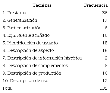 Como podemos apreciar en los datos de la Tabla 22, la técnica que presenta una mayor recurrencia es el préstamo (36 apariciones), seguida de la identificación del usuario (18 casos), la generalización (17 veces) y la descripción de aspecto (16 ocurrencias).