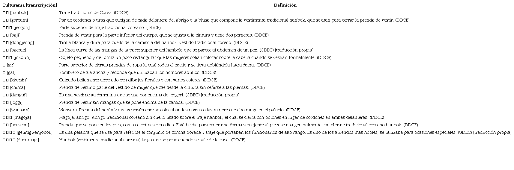 El vaciado de los textos dedicados a la vestimenta tradicional ha arrojado un total de 18 culturemas referidos a prendas de hombre, mujer y niños, además de accesorios y adornos complementarios al hanbok. Los culturemas que hemos seleccionado para el presente trabajo se representan en la Tabla 2, acompañados de las definiciones procedentes en su mayoría del Diccionario didáctico de coreano-español del Instituto Nacional de la Lengua Coreana (DDCE)10, un diccionario bilingüe (coreano-español), o, en caso de que el citado diccionario no lo tuviera registrado, recurrimos al Gran diccionario estándar de coreano (GDEC)11 del mismo instituto, pero monolingüe, al que incorporamos una traducción propia fiel a la definición.
