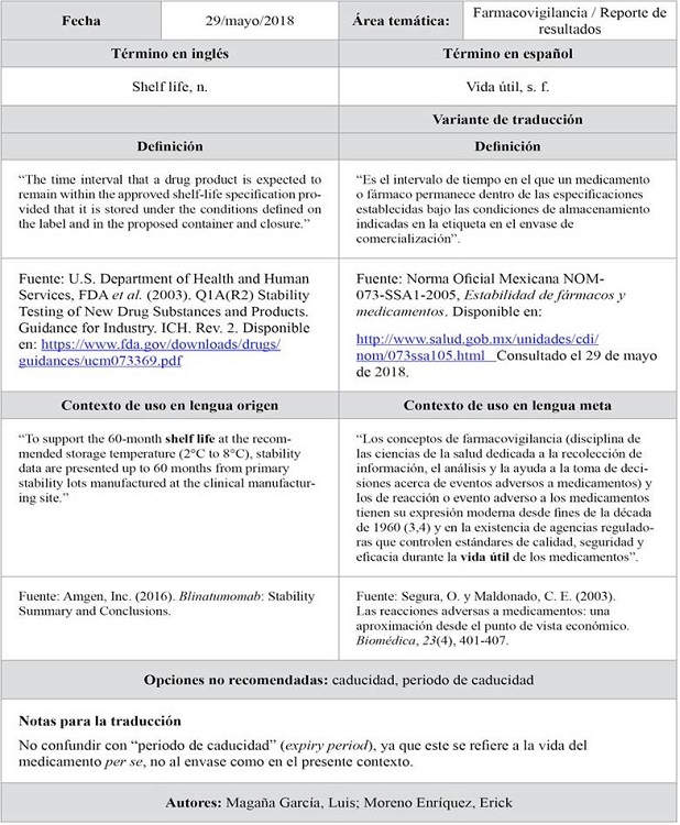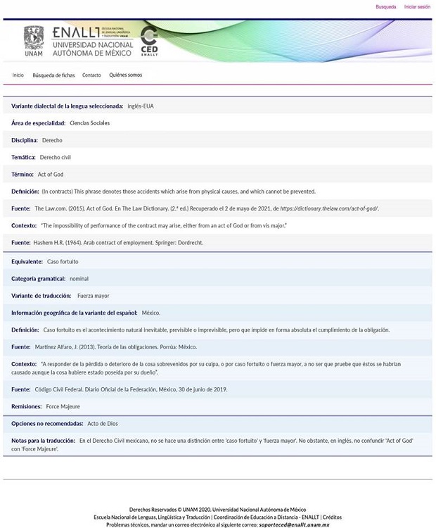Las necesidades del traductor, que son de naturaleza léxica (en lengua de origen y metaequivalentes), conceptual y textual, se ven reflejadas en el tipo de información que contiene la ficha, ya que la función de este producto es apoyar al traductor en el proceso de traducción y facilitarle la adquisición del conocimiento especializado de un ámbito de especialidad. Para tal fin, se propuso una estructura de la base de datos traductológica para formato digital (web), que permite la captura de las fichas, su revisión, publicación y consulta, en un portal desarrollado dentro de la Coordinación de la Educación a Distancia de la ENALLT-UNAM, un departamento multidisciplinario especializado en el desarrollo de materiales y aplicaciones educativas para la enseñanza y el aprendizaje de lenguas extranjeras, y traducción en ambientes digitales.