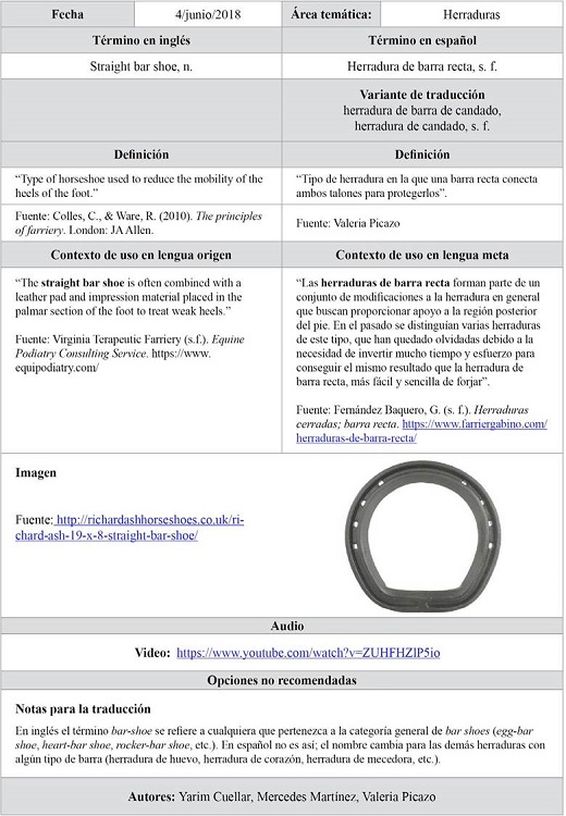Cabe resaltar que, a partir de la teoría sobre la competencia traductora y las necesidades de los traductores en el proceso de traducción, pudimos delimitar los campos de la ficha, que deja de ser simplemente terminológica y pasa a ser traductológica, por contener información útil para los traductores, como los campos de opciones no recomendadas o notas para la traducción.