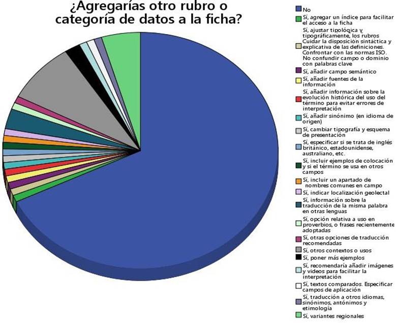 La realización de la encuesta ha aportado, además, datos interesantes para el proyecto, ya que los encuestados son los mismos usuarios, así que preguntarles sobre la utilidad de los campos existentes y brindarles la oportunidad de proponer otros nos ayudó a identificar algunas necesidades lexicográficas de los traductores especializados, las cuales podían ser atendidas por los campos de la ficha.
