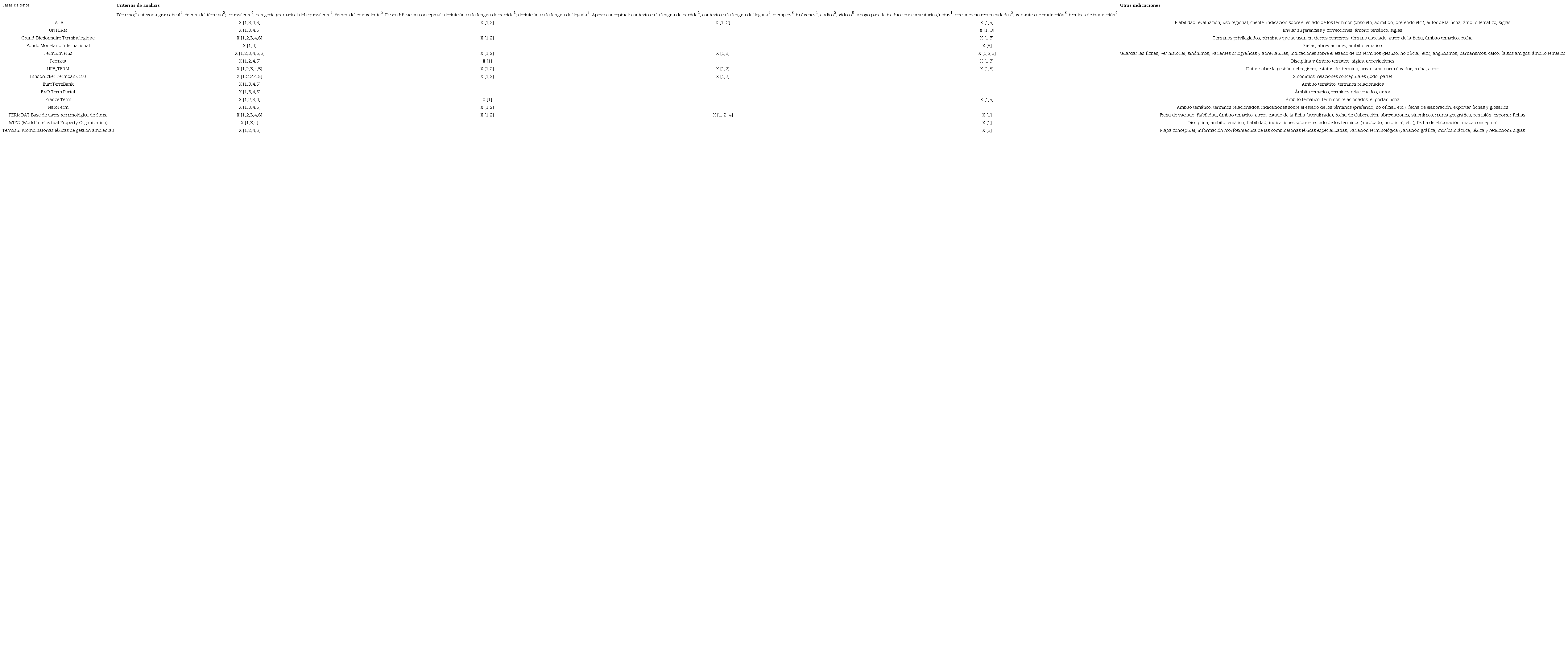 La teoría comunicativa de la terminología determina diferentes categorías de información: fonética, morfológica (sufijos, prefijos), remisiones (sinónimos, antónimos, etc.), sintáctica (contextos, ejemplos), semántica (definiciones, contextos definitorios), pragmática (relación con los árboles de campo, marcas de variación lingüística), ilustraciones, fotografías, símbolos (Cabré et al., 2018, pp. 184-186). Esta información puede aparecer representada en fichas monolingües, monolingües con equivalencias, o bilingües. No obstante, observamos que este tipo de información es de orden más bien lingüístico y muy poco conceptual, mientras que la información traductológica tiene poca representación, como podemos observar en el siguiente apartado, en la Tabla 1 sobre el análisis de las bases de datos terminológicas existentes. La información traductológica relacionada con las estrategias y técnicas de traducción, las traducciones incorrectas o los comentarios para la traducción serían elementos de gran utilidad para un traductor.