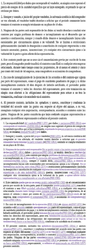 En segundo lugar, como indican Läubli et al. (2020), las TH tienen una visión más global del texto, y aunque no utilicen siempre la misma tipografía, sí emplean siempre la misma palabra. El término Agreement puede traducirse de varias maneras y las TH han utilizado siempre la misma palabra en todo el texto, ya sea Contrato o Acuerdo. En cambio, la TA presenta vacilaciones en su uso y emplea ambas traducciones, que son correctas, pero no son coherentes en un mismo texto. De esto se puede extraer que el estudiantado sale beneficiado, porque tiene una visión más global del texto, mientras que la TAN funciona segmento por segmento, no teniendo en cuenta el significado global.