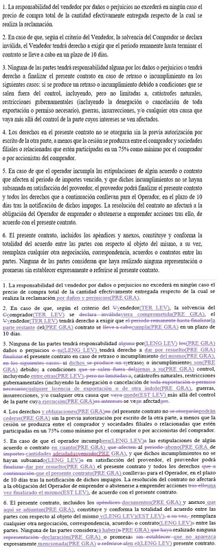 En relación con la coherencia terminológica, se observan dos diferencias importantes: en primer lugar, el uso de mayúsculas y minúsculas. La TA conserva el estilo tipográfico del TO y, en consecuencia, si en la versión en inglés aparece Seller o Supplier en mayúscula, la máquina también ofrecerá estos términos en mayúsculas, como Vendedor o Proveedor en el texto traducido. Afortunadamente para la TA, el lenguaje jurídico español permite el uso de mayúsculas en este supuesto, aunque debe tenerse en cuenta que el empleo de mayúsculas en español difiere en gran medida respecto al del inglés en muchas otras situaciones. Las TH, en cambio, no presentan un uso coherente y vacilan en su uso. Los términos a veces aparecen en mayúsculas y otras en minúsculas. Ambas opciones son correctas, pero la coherencia en un mismo texto es clave, elemento que beneficia a la TA respecto a las TH.