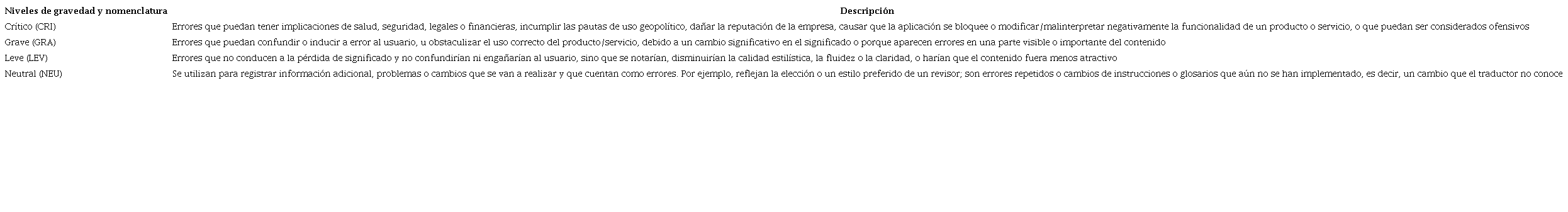 A continuación se establecen cuatro niveles de gravedad: crítico, grave, leve y neutral (véase Tabla 2). Estos se atribuyen a los errores, dependiendo de su repercusión. Debe quedar también muy claro para el evaluador en qué momento aplicar cada nivel de gravedad, para que se haga un uso uniforme y homogéneo de los criterios de evaluación.