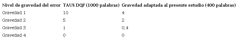 Según la bibliografía más reciente sobre el tema y de acuerdo con la propuesta del método DQF de TAUS, existe un límite de errores reconocido ampliamente para las traducciones de difusión, es decir, aquellas que requieren una calidad mayor: 20 puntos de penalización. Ergo, todas aquellas traducciones que, tras la evaluación, obtengan 20,01 puntos de penalización o más, se considerará que están suspendidas y que no tienen la calidad suficiente como para publicarse. En cambio, para adaptar esta valoración al presente estudio, se ha establecido una cantidad de puntos de penalización que cuenten como límite de puntos de penalización en el contexto de una asignatura del último curso de la carrera de TeI.