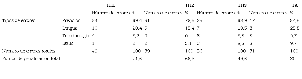 Según los criterios que hemos establecido para conseguir el aprobado en la asignatura de Traducción Jurídica durante el último año del grado en TeI, una traducción debe obtener como máximo 40 puntos de penalización. En este supuesto, solo la TA aprobaría y las tres TH suspenderían, quedándose la TH3 relativamente cerca del aprobado, con 49,6 puntos de penalización. Estos resultados son relevantes a la hora de analizar la utilidad de la TA como herramienta didáctica en el aula de Traducción Jurídica.