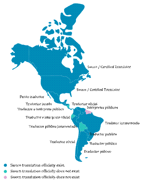 Sworn translators and interpreters are a group of individuals that are also known as legal or court translators/interpreters because of their specific acting scenarios (i.e., mostly legal or govern mental situations; Pym et al., 2012, p. 26). They exist almost all around the world and their ac tivity, denominations, and regulations are very diverse. In terms of activities, what can be seen is that, while their main task in countries such as the United States is to translate/interpret from and into languages like Spanish, Chinese, and Italian (Hammond, 1990), in some South American countries, their task is to translate/ interpret from and into indigenous languages (Quiroz et al., 2015). Concerning regulation, while in Canada their activity is regulated by associations (Hlavac, 2013), in Spain they are regulated by the government (Heras, 2017; Mayoral, 2000; Ordoñez, 2009), and in Colombia, according to Decrees 382 and 2257 (Colombia, Diario Oficial, 1951b; Colombia, Diario Oficial, 1951a), they are overseen by two public universities (Universidad de Antioquia and Universidad Nacional, as reported by Clavijo, 2011). Finally, regarding denominations, while in countries such as the United States and Canada they are called certified, in Europe they are called legal, sworn or authorized translators (Pym et al., 2012), while in some South American countries they are called juramentados (Peru, Brazil), públicos (Venezuela, Argentina, Uruguay, Paraguay), or oficiales (Colombia, Chile; see Figure 1).