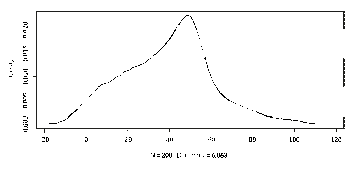 Quantitative variable: The only quantitative variable examined in this study is denominated here as “percentage of work dedication to translation or interpretation into language A (Spanish).” In order to get this information, translators were asked to indicate the percentage of work they dedicated to translating or interpreting from the additional language of their certification into Spanish. When examining this variable, we applied the Shapiro Wilk test to determine whether this variable had a normal distribution or not; and the result of the test, with a p value of 2.926e 05, led this study to conclude that indeed this variable could only be explored by means of non parametric statistics tests since it does not comply with one of the assumptions parametric tests have to be used: that the quantitative variable(s) must have a normal distribution. As can be observed in Figures 2 and 3, the distribution of this variable is very irregular when comparing it to the Gaussian Curve. To conclude, it is crucial to mention the process of imputation used in this variable. In order to get as much information as possible from the sample, a process of imputation for statistical mean for all the cases in which there was not information about the percentage when crossed with the qualitative variable was made in this study. In almost all cases, a maximum of 11 imputations were made. The statistical mean for this variable was 39.3 %.