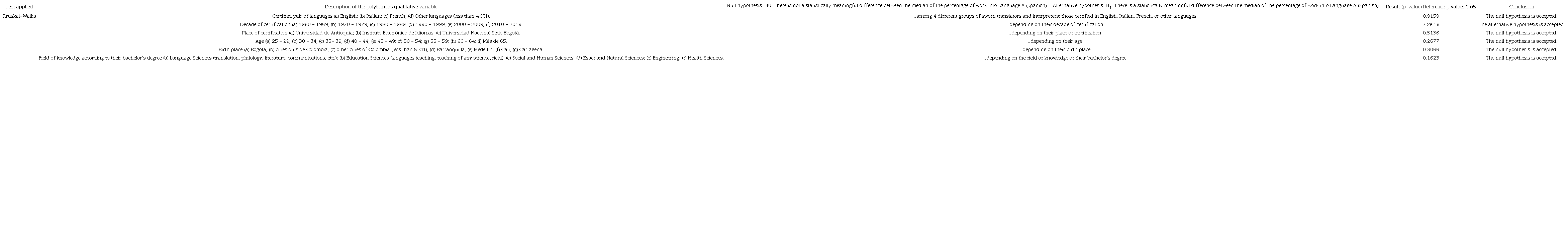 Kruskal-Wallis test: For this test, several hypotheses were made and proven within the same group of sworn translators, all of the remaining variables mentioned before were used here.