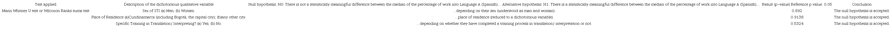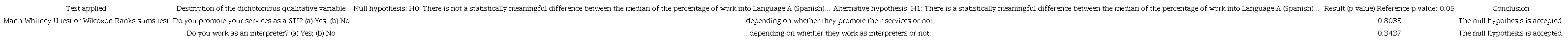 Mann Whitney U test or Wilcoxon Ranks sums test: This test was applied for the qualitative variables “sex” (man or woman), “place of residence” (Cundinamarca or a place different from Cundinamarca), whether STIs had any specific training in translation or not, whether STIs promoted their work or not, and finally, whether STIs worked as interpreters too or not.