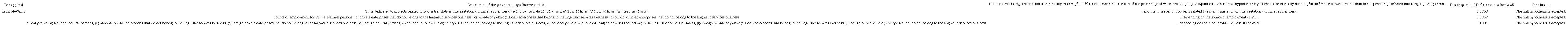 As can be seen in Tables 4 and 5, statistical tests show that there is not a statistically meaningful difference between the median of the percentage of work into Language A (Spanish) and the time spent in projects related to sworn translation/interpretation during a regular week. The same is true for the source of employment for STIs or the client profile, and the promotion of services or work as an interpreter. This information suggests, at the same time, several issues than can be more deeply discussed or analyzed, given that, as stated before, from a statistically descriptive point of view, the percentage of work into an additional language among STIs is superior (60 %) to the amount of work done into Spanish.
