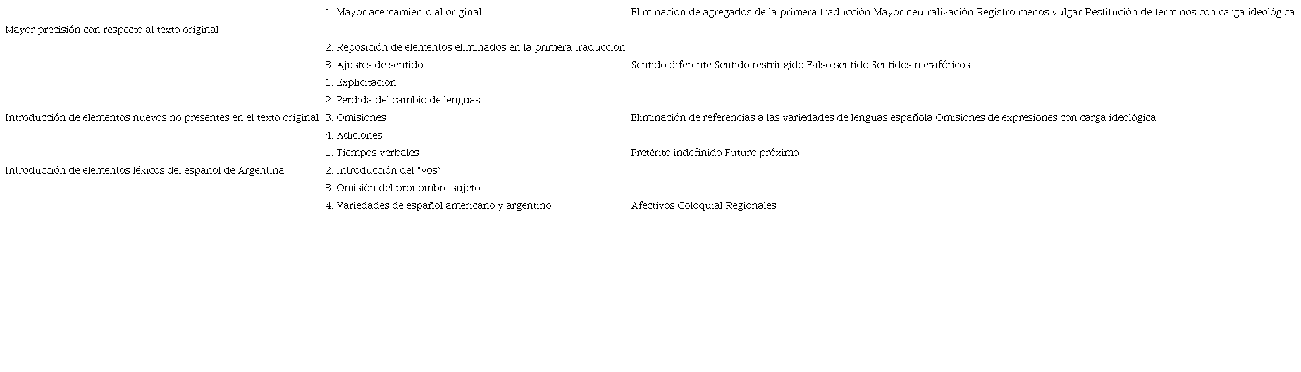 Basándonos en la nomenclatura de López López-Gay, luego de observar nuestro corpus, el original en francés y las dos traducciones al español, hemos reunido las transformaciones observadas en lo que llamaremos aquí “transformaciones de la semiautotraducción” en tres categorías. Por un lado, adoptamos dos de las tendencias propuestas por López López-Gay: en primer lugar, la de alcanzar una mayor precisión que en la primera traducción con respecto al original; en segundo lugar y menos marcada, la de introducir elementos nuevos en la segunda versión, no existentes en el original. Por otro lado, agregamos una tercera tendencia, la de introducir elementos léxicos propios de la variedad de español rioplatense hablada en Argentina. En la Tabla 1 mostramos la taxonomía de subcategorías, de cosecha propia, dentro de cada una de las tres tendencias.
