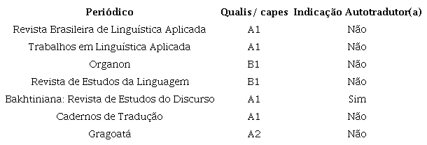 Em resumo, a Tabela 1 inclui os periódicos citados na seção, a classificação Qualis/ CAPES de cada uma das revistas e o procedimento adotado por seus editores em relação à indicação (ou não) do nome dos autotradures: