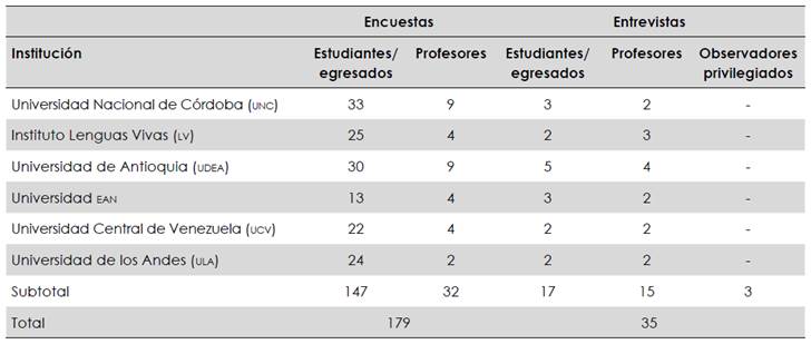 Para la recolección de datos, nos propusimos contactar entre tres y cuatro estudiantes o egresados (18 a 24 en total) y al menos a dos profesores o directivos de cada institución (doce en total), incluyendo participantes de cada programa, idioma, y nivel de estudio, cuando fuera posible.