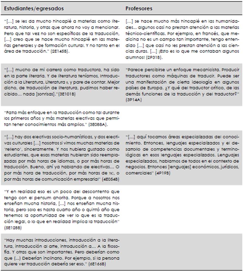 Independientemente de si las carreras están orientadas a formar traductores públicos (unc), generales (lv, udea, ucv) o Profesionales en Lenguas Modernas (ean, ula), la inclusión de varios campos del saber, en la forma de asignaturas de formación sociocultural y temática ofrece un panorama amplio, aunque no profundo, de temas de estudio que los estudiantes podrán seguir estudiando, en una eventual formación de posgrado como traductores. Las temáticas más enseñadas tienen que ver con literatura y aspectos culturales de las lenguas estudiadas; también se incluyen aquí materias de ética, introducción a la filosofía, al arte, o a la historia. En el caso de ean se enfatiza bastante en temas de empresariales, organizacionales y de negocios. En algunos de los comentarios (Tabla 10) se observa cómo los participantes parecen ver la formación sociocultural como un aspecto de menor importancia, y sugieren remplazar algunas de esas materias por otras orientadas a la práctica de traducción, directamente.