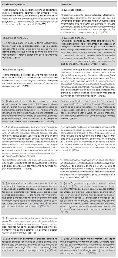 La información recolectada nos muestra que hay una disparidad no solo en la manera en que se realiza la enseñanza de la traducción en los distintos países y programas, sino en los recursos de que se dispone para su funcionamiento. Una queja común es la falta de recursos tecnológicos y de espacios físicos para la prestación del servicio educativo de calidad, una situación que es más palpable en la ucv y en la ula, en Venezuela y, en menor medida, en lv de Argentina. Por otra parte, tanto la unc, como udea y ean (esta última privada) parecen contar con recursos adecuados para la realización de su labor educativa. En todos los casos, sin embargo, se observa que es el recurso humano (representado en los docentes y directivos) tiene un compromiso por luchar, por sacar adelante los programas de las respectivas instituciones con iniciativas para cada dificultad y, en ocasiones, con espíritu de sacrificio. Así se reconoce en los comentarios recibidos.