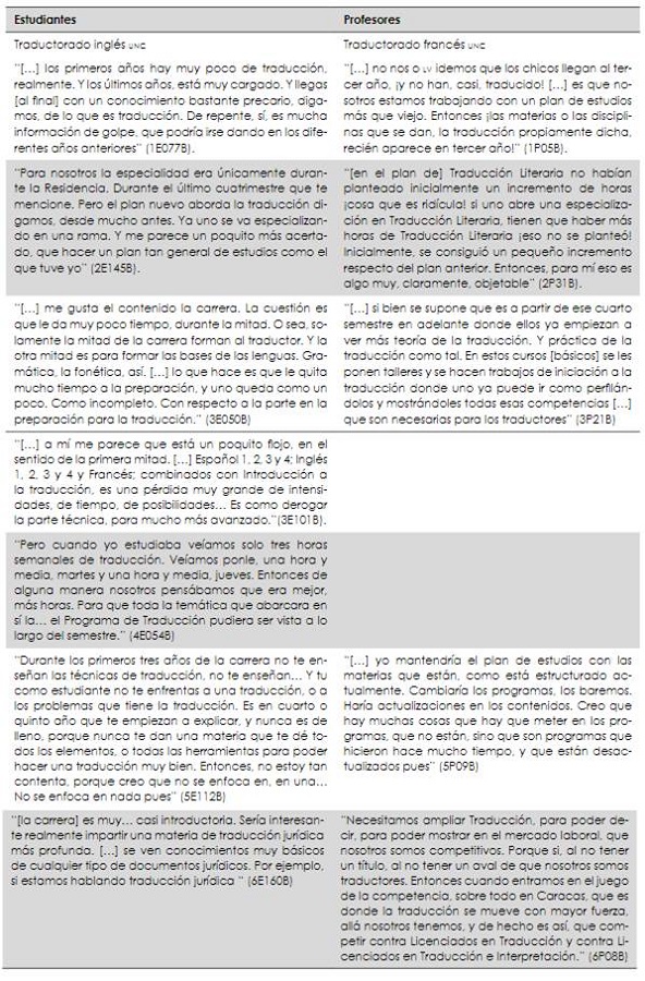 El paso siguiente consistió en contrastar los hallazgos en los planes curriculares con los datos obtenidos mediante los demás instrumentos del estudio. Para ello rastreamos las encuestas y entrevistas en busca de opiniones o comentarios de los participantes que develaran sus percepciones respecto a las distintas prácticas y experiencias académicas surgidas a partir de los programas de estudio. También contrastamos la opinión de estas personas sobre aspectos como la adecuación de los planes curriculares, el cumplimiento de los objetivos de las asignaturas, el uso de tecnologías en la enseñanza, la distribución de materias y cargas horarias, entre otros.