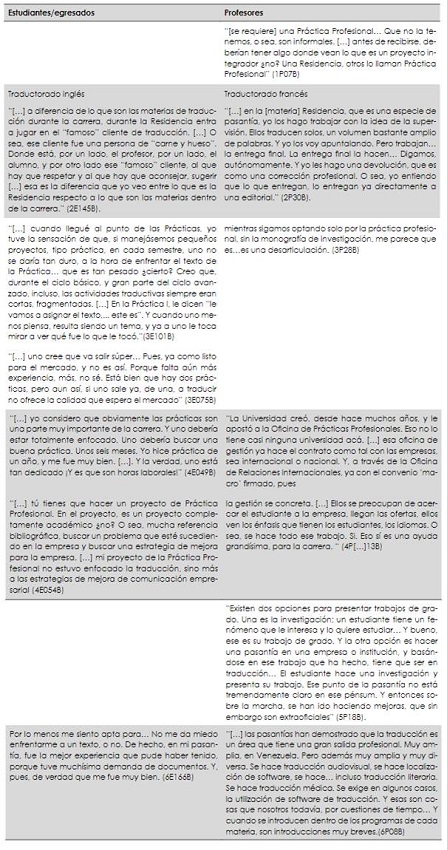 Como se mencionó anteriormente, con esta área nos referimos específicamente a las actividades a asignaturas que se requieren para optar al título de grado, tales como la realización de las prácticas profesionales, pasantías, monografías de grado, o trabajos similares. En este aspecto encontramos bastante diversidad entre las instituciones elegidas. En algunos casos, los requisitos de este tipo no se contemplan en el plan de estudio (unc), mientras que en otros, se siguen criterios más de tipo investigativo dirigidos a realizar un trabajo monográfico (ucv). En los programas de lv, udea y ula, aunque la realización de las prácticas sigue unas directrices específicas en cuanto al tipo de encargo, tamaño del texto, tiempos de entrega, etc., no se observa una relación real con el mundo laboral. Lo anterior se debe a que las traducciones se realizan principalmente como un servicio gratuito para las demás dependencias al interior de cada institución y, por ende, su cumplimiento no está mediado por una relación contractual que obligue a los practicantes a cumplir con los encargos, más allá de lo que establece la evaluación de las asignaturas respectivas (ver testimonios en Tabla 13).