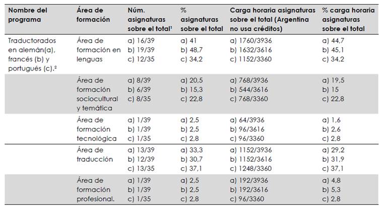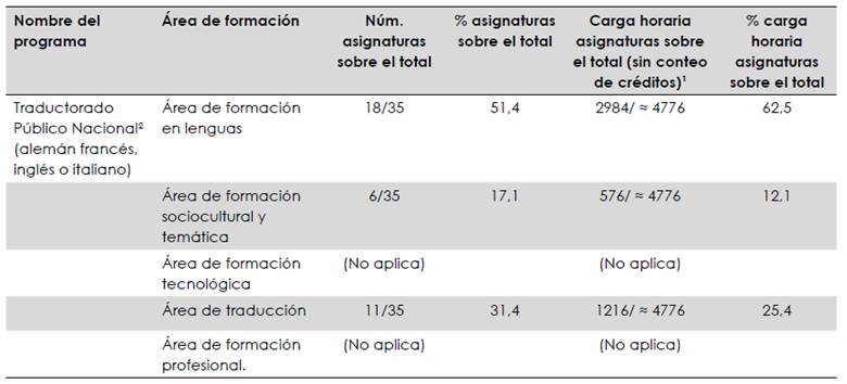 La carga horaria más alta en esta área, en relación al total de horas académicas, la tiene el traductorado Cientifico-Tecnico en inglés de lv, con un 45,6% del total. Además, todos los demás traductorados de esa institución dedican como mínimo el 29% de su tiempo a este tipo de materias. En orden descendente, los dos programas de la ucv (Licenciatura en Traducción e interpretación y Licenciatura en Traducción) dedican al área 32,3% y 24,8% de su tiempo, respectivamente. Con un porcentaje similar, las ofertas de la unc rondan el 25% en dedicación a la formación en traducción.