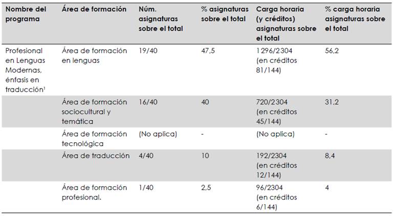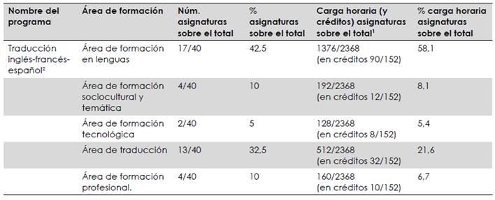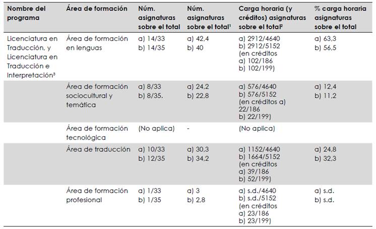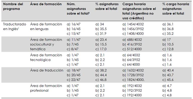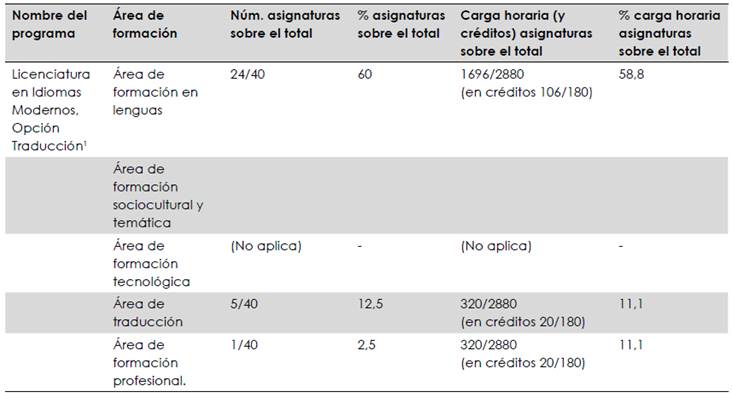 A diferencia de los tres primeros traductorados de lv (Tabla 4), el de inglés tiene una distribución de materias y cargas horarias planeadas para la formación en tres especialidades diferentes, con variación entre el número de asignaturas y de horas ofrecidas: a) Traducción Literaria y en Medios Audiovisuales; b) Interpretación; y c) Traducción Científico-Técnica, estas especialidades comparten las áreas de formación en Lenguas, Traducción, y Sociocultural y Temática, para luego dividirse en lo que ellos llaman ‘Campo de Formación Profesionalizante’.