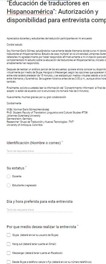 Como en el resto de este estudio, las entrevistas se realizaron con ayuda del internet. Estas se llevaron a cabo entre los meses de junio y septiembre de 2017, e involucraron a un segmento de participantes elegidos entre los dos grupos de encuestados -por medio de una pregunta incluida en las encuestas, en la que se les solicitaba su autorización para ser entrevistados posteriormente (véase Anexo 1). Como complemento, se condujeron entrevistas con tres expertos u “observadores privilegiados” (dirigentes gremiales, académicos o investigadores de la traducción, uno por país), quienes fueron consultados “[…] no como parte del fenómeno estudiado, sino como conocedores expertos del fenómeno, con una visión directa y profunda del mismo que los sitúa en una posición de observación privilegiada” (Ibíd., p. 358).