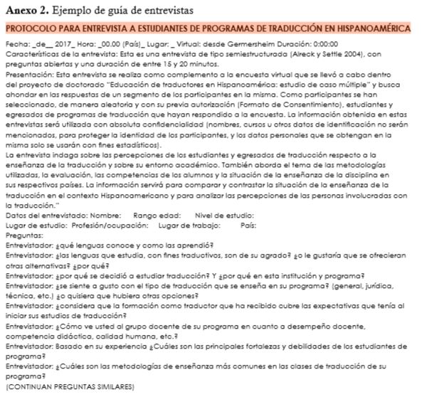 Para la realización de las entrevistas se elaboró una guía (véase Anexo 2) con una serie de preguntas semiestructuradas, de acuerdo con los tres grupos de entrevistados. Tal protocolo contenía la presentación de la entrevista, la cual se dividió en un segmento de información personal y un segmento de preguntas abiertas en torno a temas como: las razones para estudiar traducción; el motivo para elegir el programa; la opinión de la formación recibida; el conocimiento del plan de estudio; la facilidad de acceso a los medios tecnológicos; la percepción sobre la traducción en general, entre otras. En general, intentamos seguir las sugerencias a continuación,