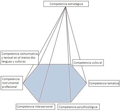El modelo por competencias de Kelly (2002) define la competencia traductora como “la macrocompetencia que constituye el conjunto de capacidades, destrezas, conocimientos e incluso actitudes que reúnen los traductores profesionales y que intervienen en la traducción como actividad experta” (pp. 14-15). De este modo, esta macrocompetencia se desglosa en las subcompetencias que se presentan a continuación en forma piramidal, donde la competencia estratégica -competencia de transferencia para otros (Beeby, 1996; Hansen, 1997; Hurtado 1996; pacte, 2000)- ocupa un lugar particular, en la medida en que articula las otras subcompetencias frente a un encargo de traducción: