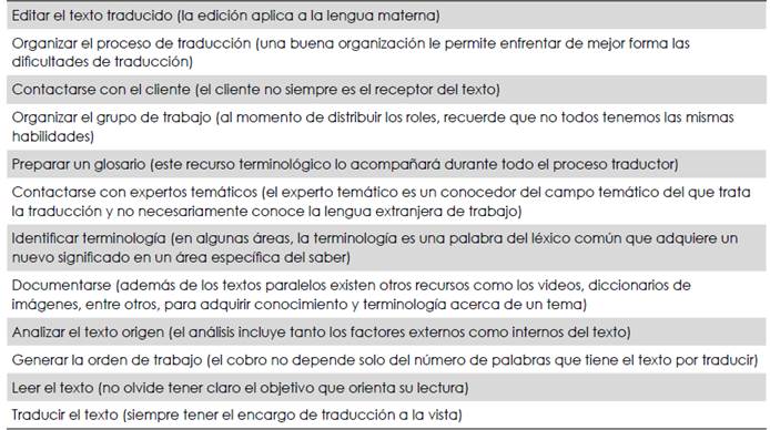 Instrucción: al momento de generar una orden de trabajo, son variados los factores que se deben tener en consideración, por ejemplo, ¿el texto presenta mucha terminología? Si el cliente solicita que el trabajo sea realizado con una memoria de traducción, ¿cuento con esta? ¿Conozco algún experto temático que pueda ayudarme a resolver dudas puntuales sobre el texto?, entre otros. El docente solicita a los estudiantes que hagan una lista de todos los elementos que deberían considerar al momento de emitir un presupuesto de traducción. Para realizar esta tarea es relevan te haber realizado al menos una lectura del texto por traducir; solo así el estudiante será capaz de visualizar la tarea y responder a las consultas planteadas. Luego, los estudiantes comparten sus ideas con el resto de la clase y generan un listado final con los puntos que todos considerarán.
