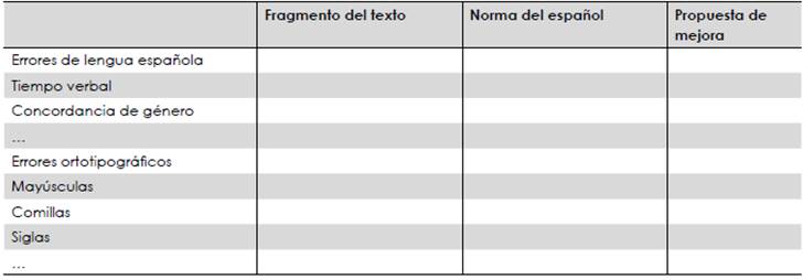 Instrucción: el docente solicita a los estudiantes que lean la traducción realizada por otro grupo sin tener a la vista el texto original. Luego, marcan las partes del texto que les parecen no se adecúan a las normas de la lengua española, las registran en una tabla indicando la clasificación del error (tiempo verbal, concordancia de número, etc.) y fundamentan el error a partir de la norma del correcto uso del español. Posteriormente, los estudiantes realizan el mismo ejercicio con los errores ortotipográficos (uso de mayúsculas, siglas y acrónimos, raya, guion, abreviaturas y unidades de medida, punto, puntos suspensivos, vocablos extranjeros, etc.).