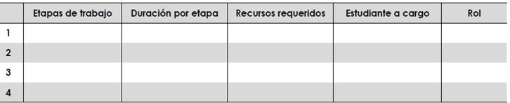 Instrucción: el docente solicita a los estudiantes que completen el siguiente cuadro, con el fin de organizar la traducción del texto: pasos a seguir, tiempo destinado para cada tarea, recurso que requiere, estudiante a cargo y rol que cumple el estudiante. Los roles contemplan: un gestor, un documentalista/terminólogo, un traductor y un revisor/editor.