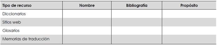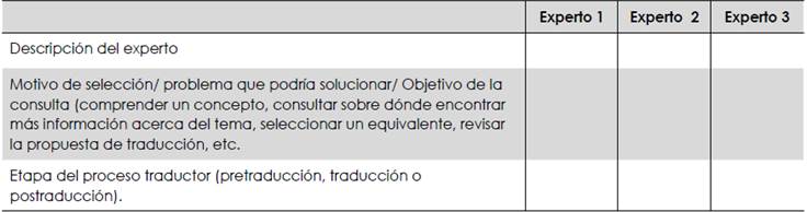 durante el trabajo, declaren el aporte que el experto puede hacer en la solución del problema e indiquen en qué etapa del proceso traductor el experto sería de mayor utilidad. Junto con esto, a través de un ejercicio de role playing, deben simular el contacto con el experto temático; en muchas ocasiones, se solicita a docentes de carreras afines con los temas a traducir que participen de esta instancia con el fin de que el estudiante se socialice con el experto y tenga una práctica de colaboración cuasi real. Luego, el docente pide a los estudiantes que indiquen, en el segundo cuadro, qué otras fuentes de consulta, fuera del contacto con expertos temáticos, les podrían ayudar a adquirir más información acerca del tema antes de traducir y a solucionar posibles problemas de traducción.