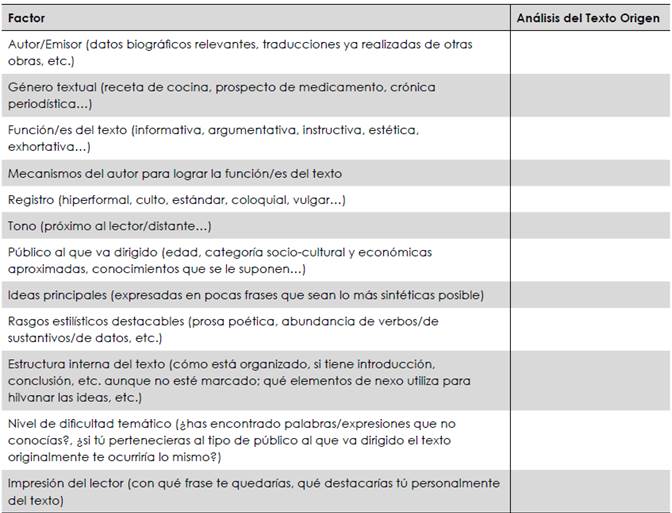 Instrucción: el docente solicita a los estudiantes que lean, de manera crítica, el texto por traducir y que, sobre la base de la ficha que se presenta a continuación,4 realicen un análisis de los principales factores del to. Luego, los estudiantes comparten el trabajo realizado con la clase. De acuerdo con Weinberg, Caamaño y Mondaca (2018):