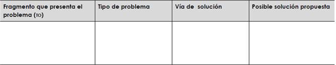 Instrucción: el docente solicita a los estudiantes que lean nuevamente el texto por traducir e identifiquen en total un número de diez posibles problemas de traducción de las siguientes categorías: de comprensión, de transferencia, de reexpresión o pragmáticos. Luego, los estudiantes completan la siguiente tabla, con el fin de prever soluciones para aquellos problemas potenciales.