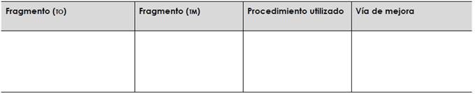 Instrucción: el docente pide a los grupos de trabajo que revisen la traducción realizada por otro grupo, con el fin de identificar en el texto traducido los procedimientos de traducción utilizados (modulación, transposición, equivalencia, etc.). Luego, los estudiantes deben completar la Tabla 8 con la información recabada y, en caso de que el procedimiento utilizado no resulte apropiado, deben proponer una alternativa que mejore la traducción. Luego, el grupo revisor entrega las propuestas de mejora al grupo evaluado.