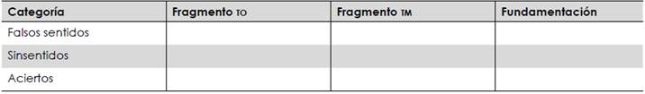 Instrucción: el docente pide a los grupos que completen la siguiente tabla con falsos sentidos, sinsentidos y aciertos6 que encontraron al revisar la traducción de otro grupo.