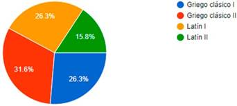 Se siguió la metodología de la investigación-acción en sus tres etapas (interés técnico, trabajo de campo e interés emancipatorio), las cuales permiten comprender y transformar las prácticas pedagógicas mediante la reflexión acerca de la labor profesional y la participación de los estudiantes (Kemmis y MacTaggart, 1988; Lewin, 1946; Martínez Miguélez, 2000; Restrepo Gómez, 2009). En la primera etapa (interés técnico), se analizaron las respuestas de los estudiantes a una encuesta anónima de tres preguntas enviada por medio de Google Drive® (vid. Tablas 1 a 3). La encuesta, de participación voluntaria, se realizó después de la finalización de las clases del segundo semestre de 2016 entre 19 informantes, alumnos de los cursos de Griego i y ii y Latín i y ii de la Universidad de la Sabana (vid. Figura 1).
