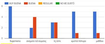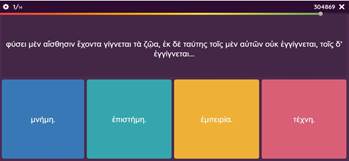 Quizizz fue elegida para reforzar no solo el vocabulario y las estructuras gramaticales, sino también para comprobar la comprensión y la interpretación del texto aristotélico, ya que las preguntas se crearon a partir del texto de la Metafísica en griego (vid. Figura 5).