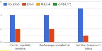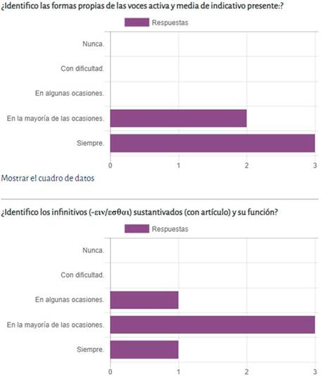 El objetivo de la encuesta era que el curso evaluara la transformación de la práctica pedagógica, la implementación de las TAC y la evaluación con e-rúbricas analíticas. Las preguntas fueron de opción múltiple con la posibilidad de hacer comentarios y sugerencias. Los resultados de la encuesta indican el éxito de la unidad, tal como puede apreciarse en el Apéndice 2. Además del impacto positivo que revelan los gráficos y las respuestas, los estudiantes manifiestan que la unidad facilitó el aprendizaje y transformó la didáctica de las clases. De las nuevas actividades, resaltaron el aprendizaje del vocabulario en SuperMemo por su notable aporte a la memorización, uno de los aspectos más difíciles en el aprendizaje de las lenguas clásicas. Los videos fueron apreciados por su creatividad y efectividad. En cuanto a la presentación del texto en OneNote®, se destacaron la organización y la utilidad de los enlaces a Perseus Digital Project, de manera que permitieron una consulta expedita del diccionario. El sistema de evaluación cumplió con su objetivo de sensibilizar a los estudiantes con su proceso de aprendizaje y de servirles de guía. Como aspectos por mejorar, los estudiantes recomendaron mejorar la calidad del audio, la duración y la inclusión de más ejemplos en los videos. También fueron señalados los problemas técnicos con OneNote®, debido a que, en algunos casos, los cambios no se guardan convenientemente en el archivo por problemas de conectividad.